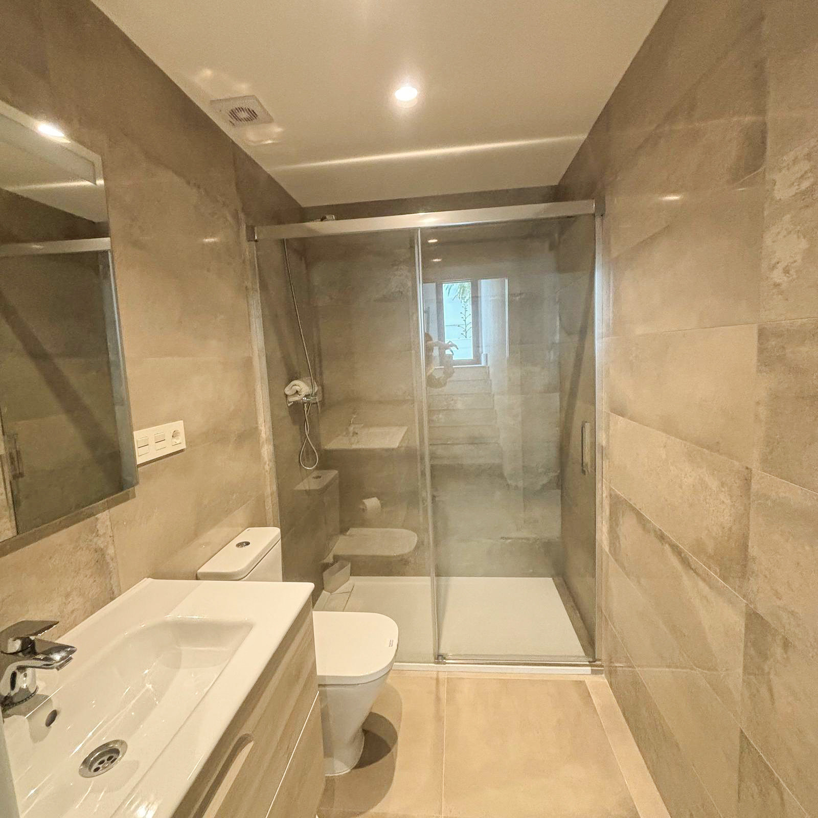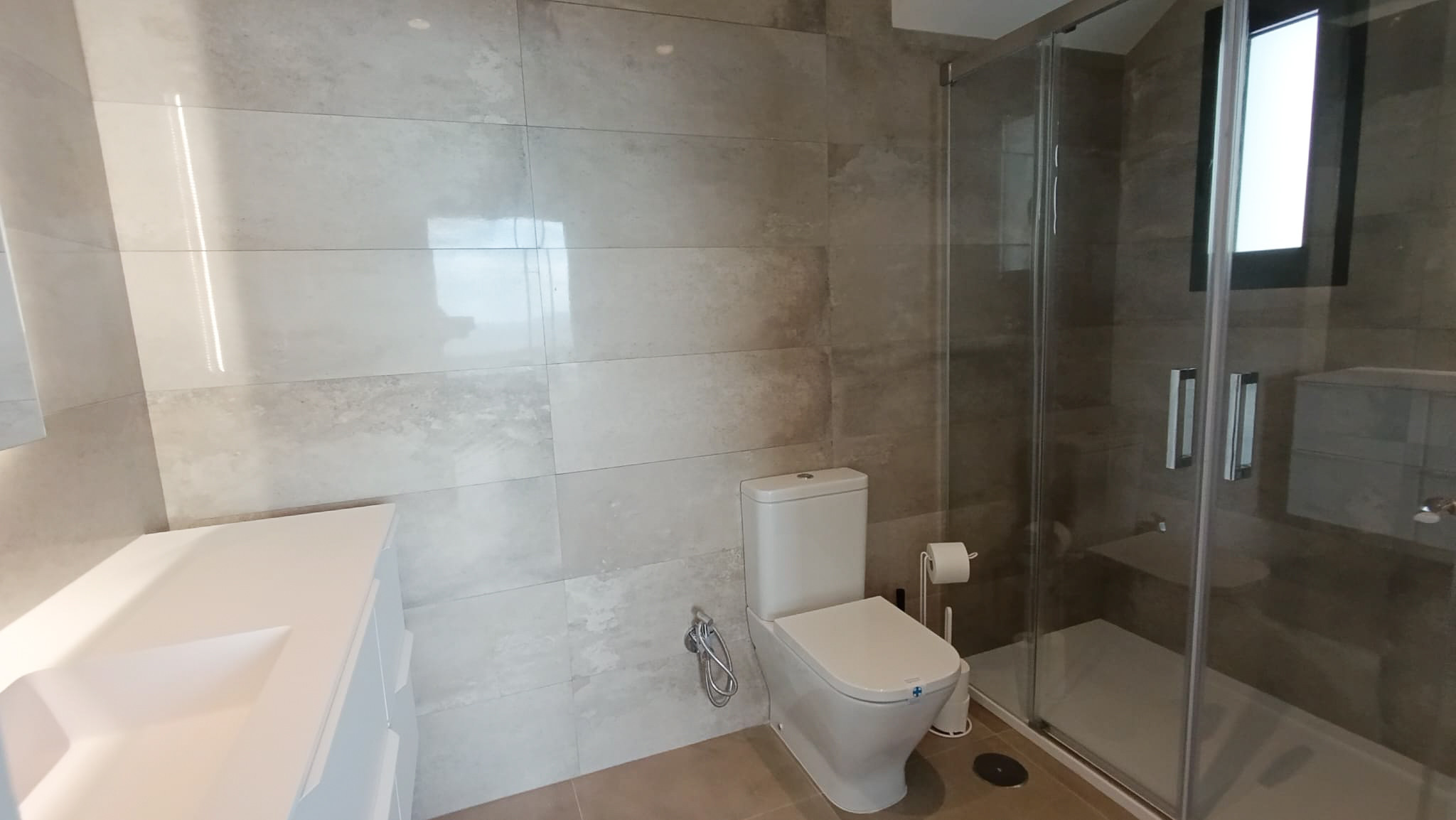 Segundo baño con ducha de acceso directo, lavabo e inodoro