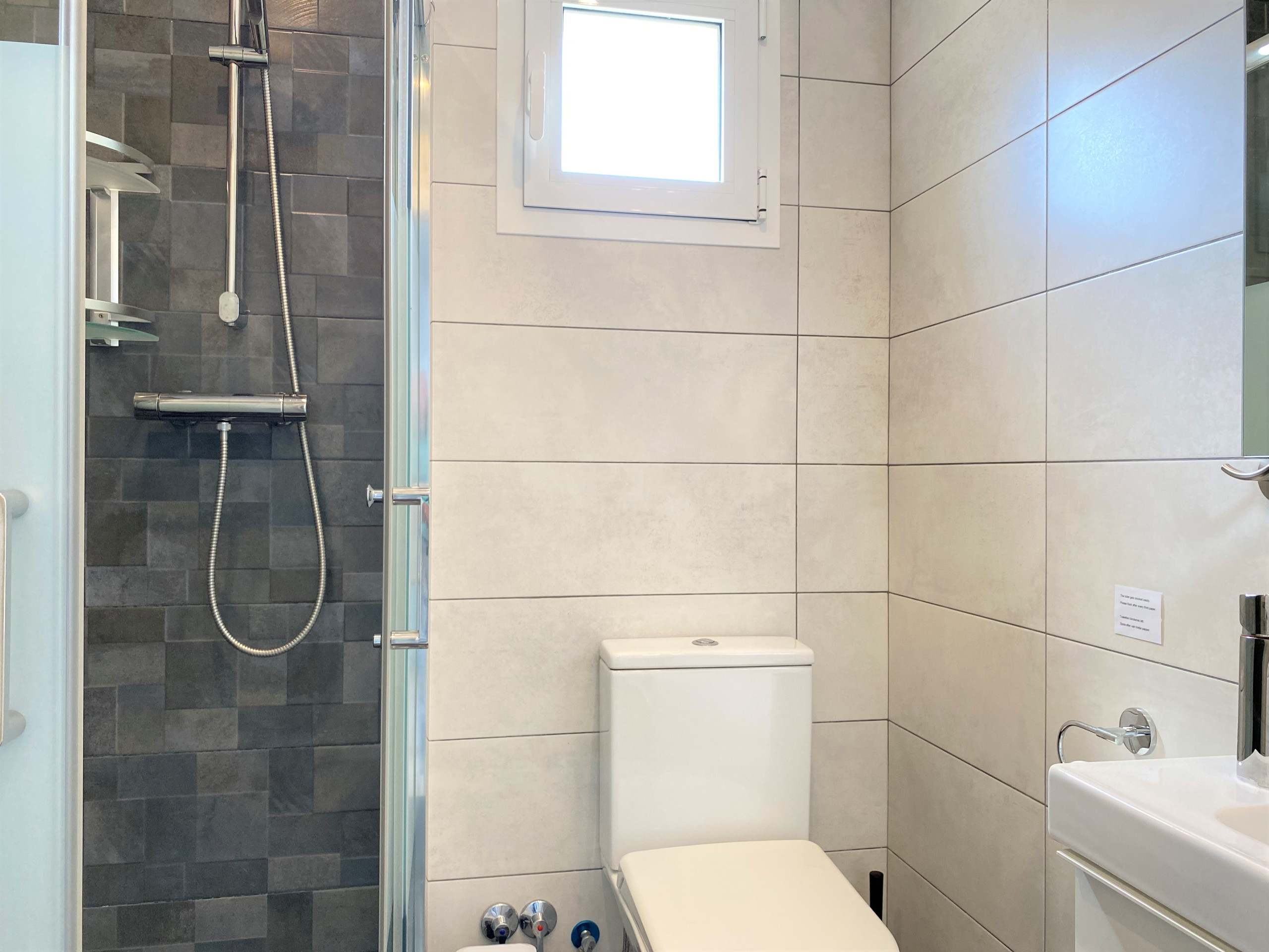 • Baño 1: Gran ducha a ras de suelo, suelo antideslizante, doble lavabo e inodoro