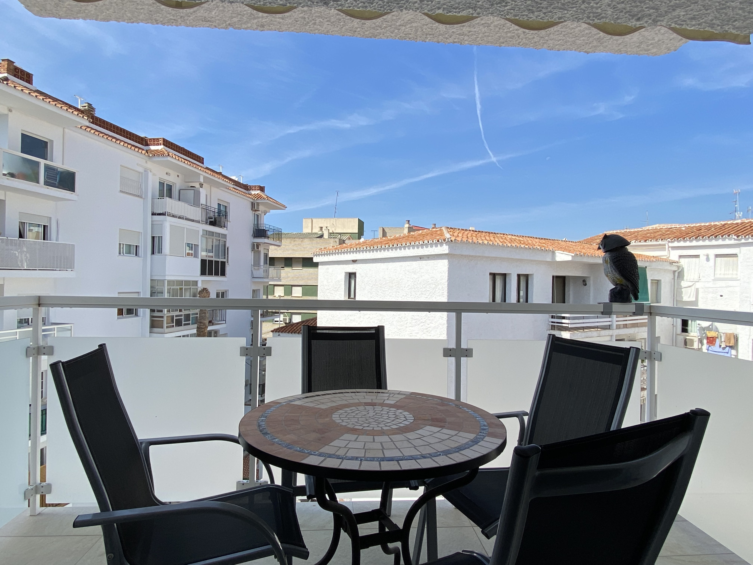 • Balcón orientado al oeste con mobiliario de terraza y toldo