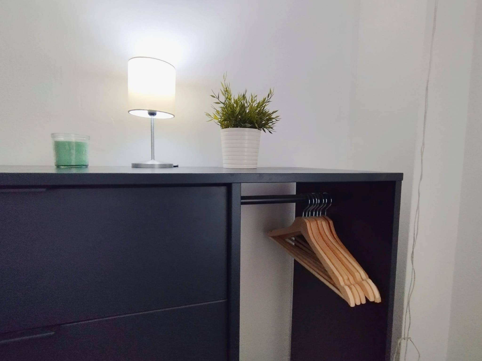 Double bed 160m x 200m, bedside tables with bedside lamps, built in wardrobe