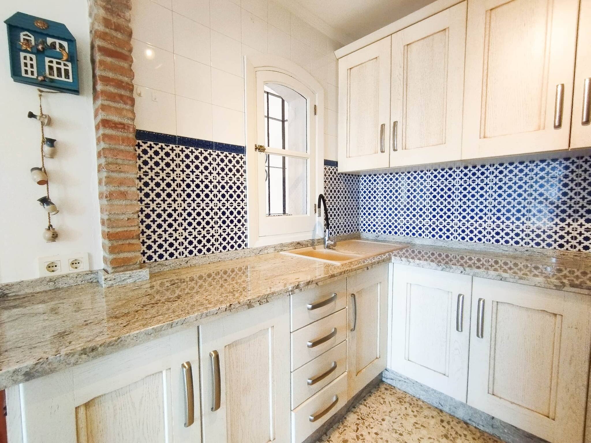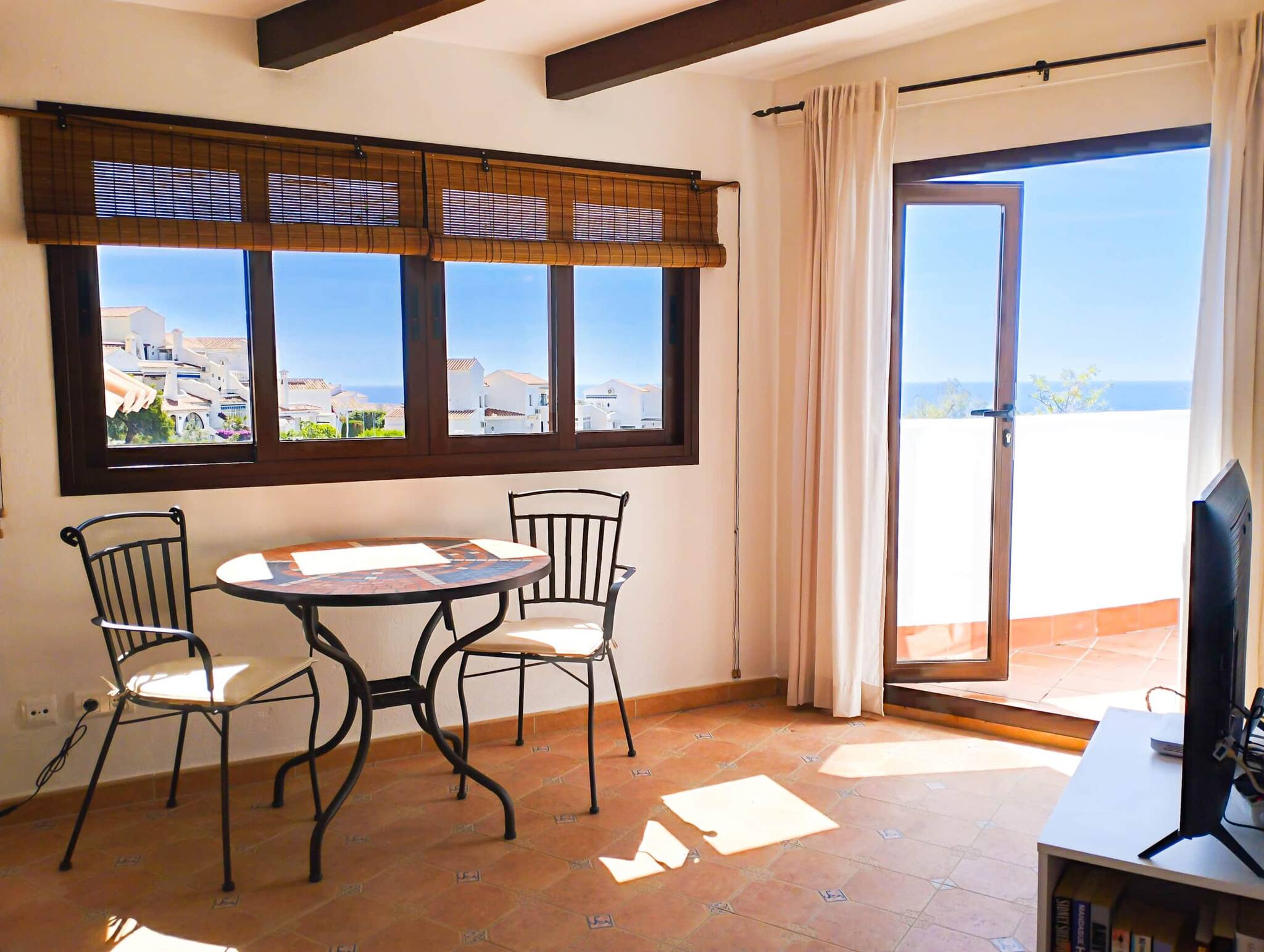 Less than a 5 min drive from Nerja center, known for the beautiful garden areas, the Urbanisation Capistrano Pueblo is the ideal holiday resort. The apartment provides one bedroom, a modern bathroom with a large walk-in shower and a fully equipped kitchen connected to the living room with a large dining table, chimney and access to a private south facing terrace.