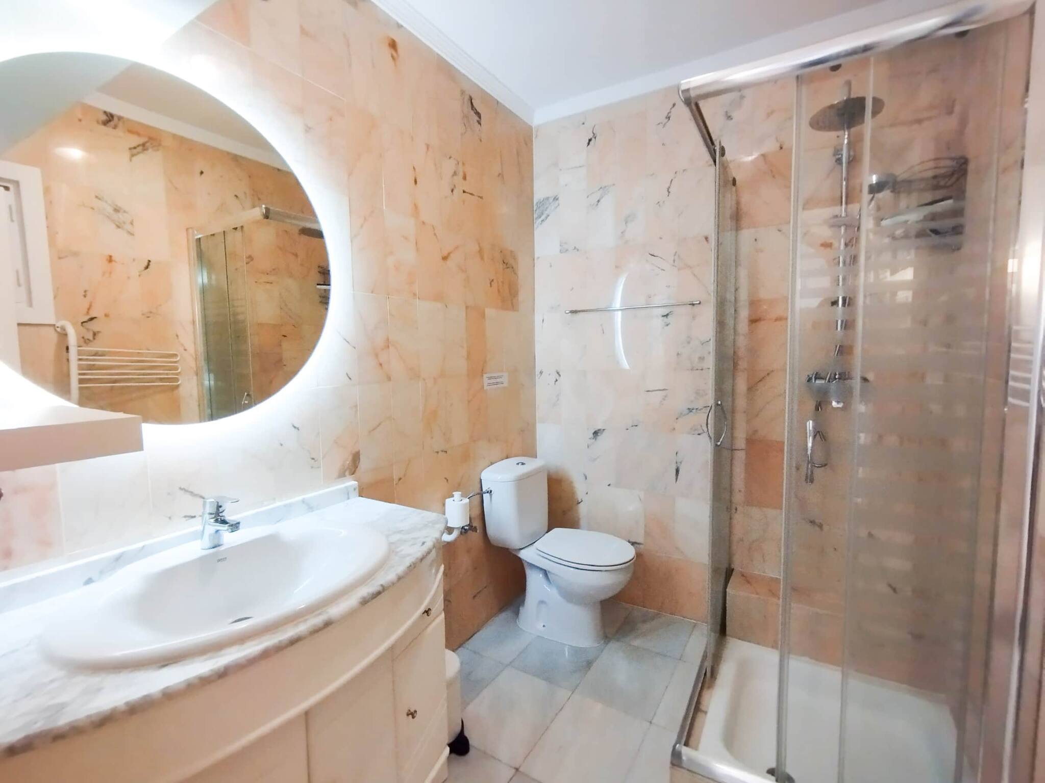 Bathroom with corner shower and sliding glass doors, WC, wall mounted mirror with lights, washing basin with underneath storage, washing machine