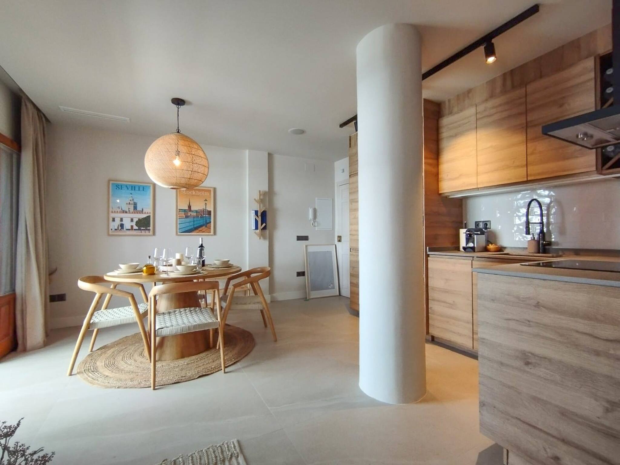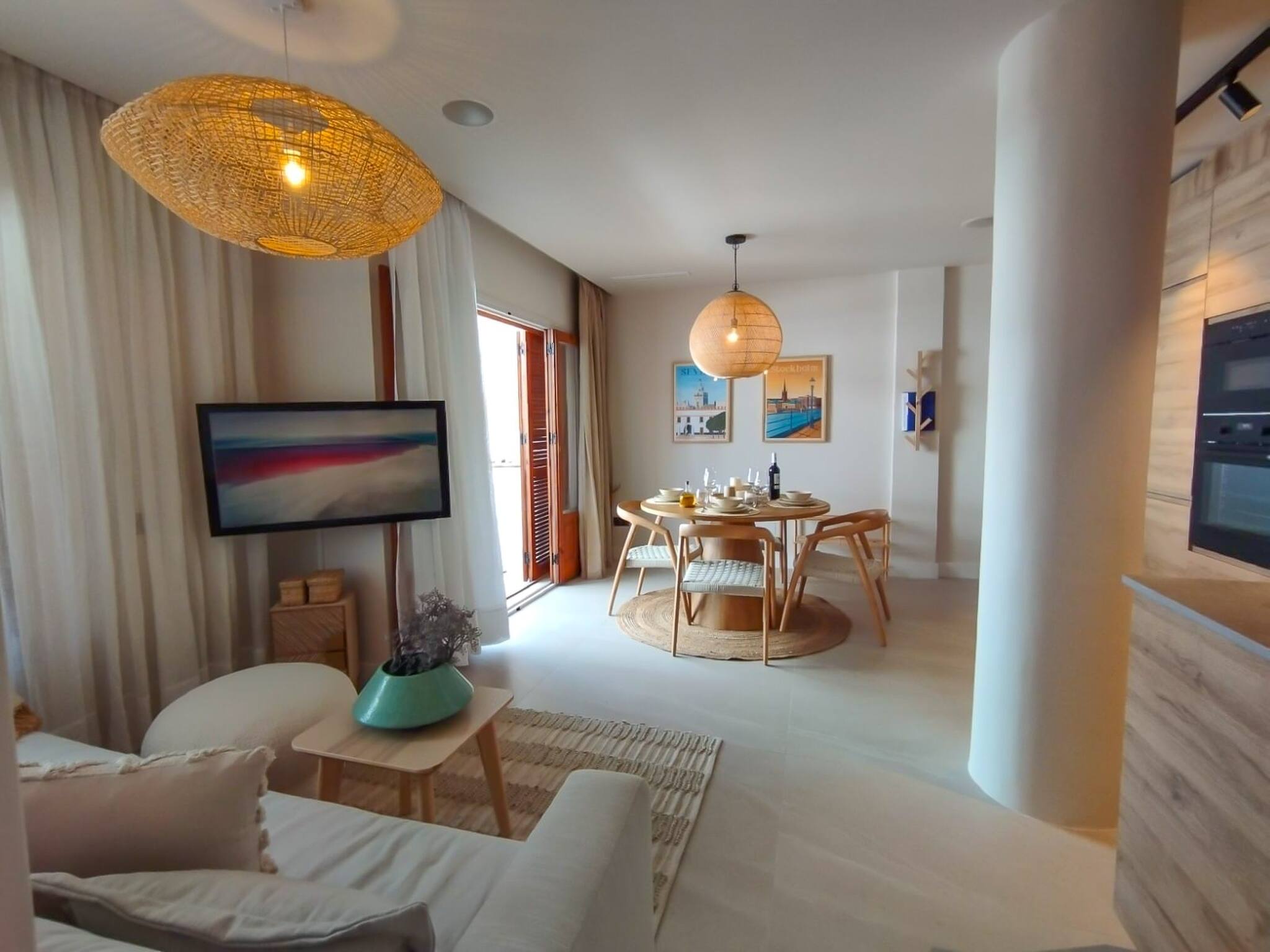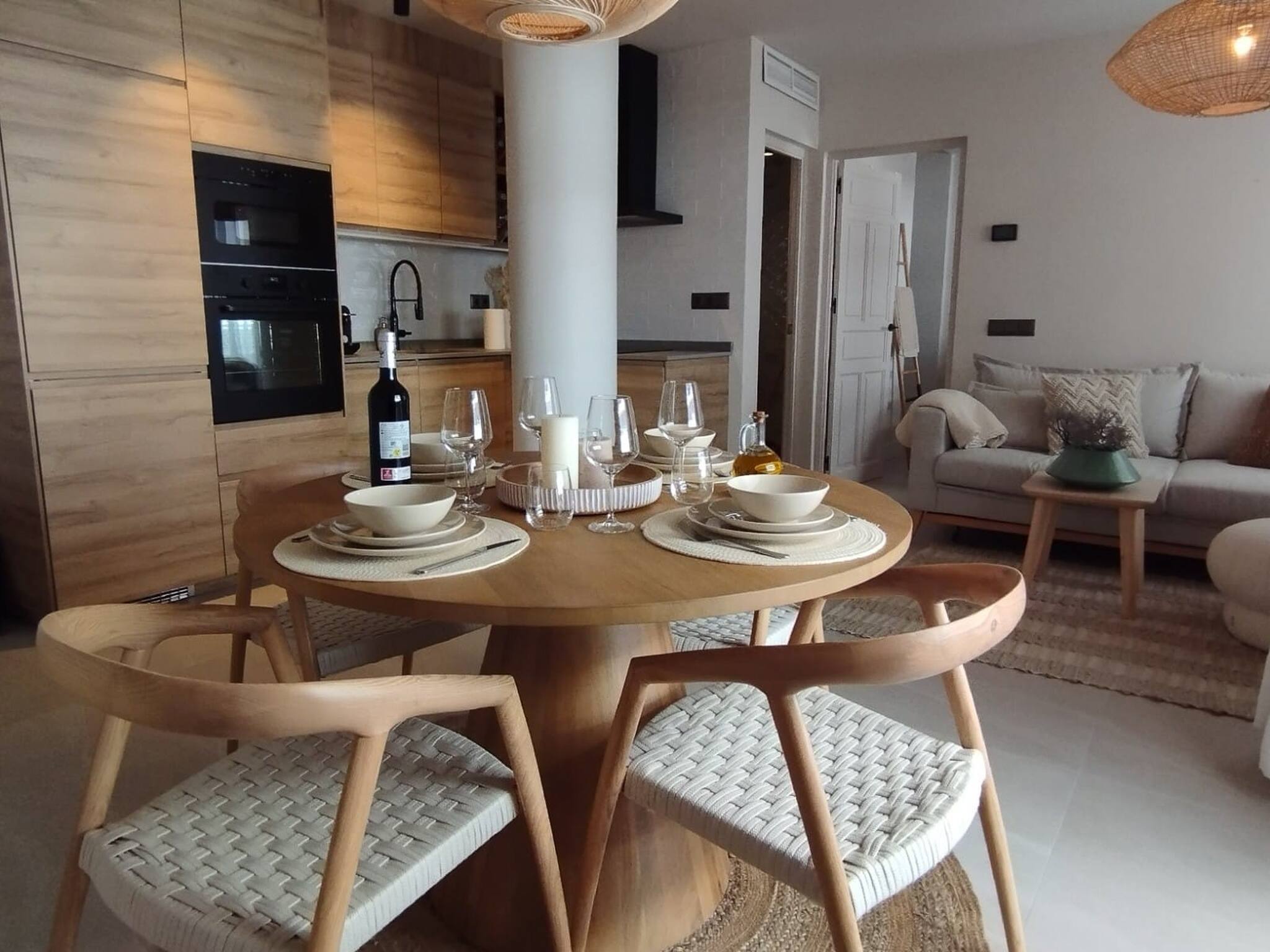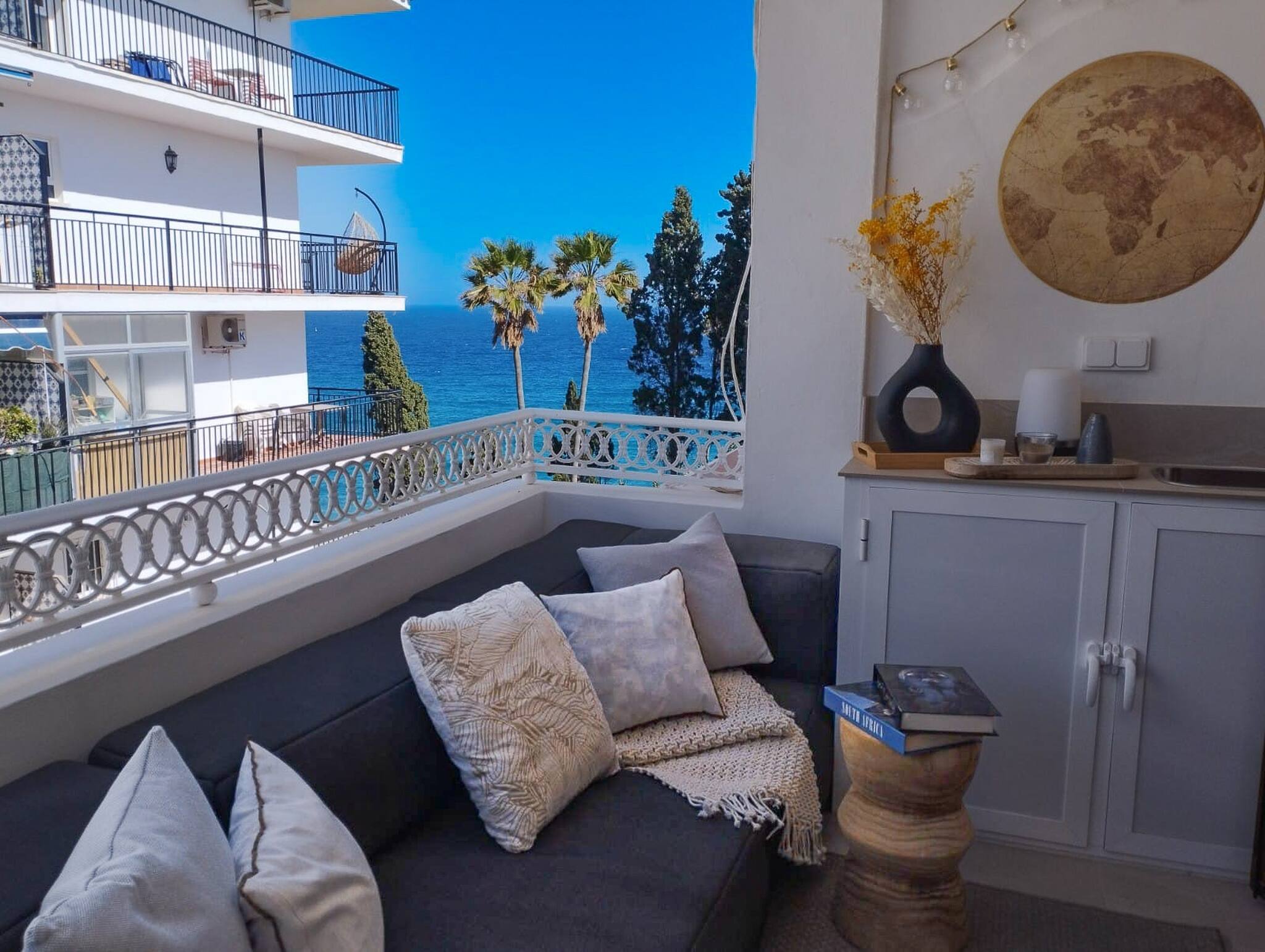 This tastefully decorated apartment is located on the 3rd floor of the popular Burriana apartments building. The apartment provides one bedroom, a modern bathroom with walk-in shower, a cosy living room with sofa bed and an open plan kitchen with a bright dining area. The private East facing balcony is equipped with a large comfortable outdoor sofa and outside kitchenette with sink and electric BBQ. The property provides a digital centralised Air conditioning / Heating system as well as bluethooth ceiling speaker in each room. The property is equipped and decorated with natural materials and bright colours as well as many modern features. This is an ideal accommodation to spend your vacation in high standard property in a central location with Nerjas most beautiful beaches at the doorstep.
