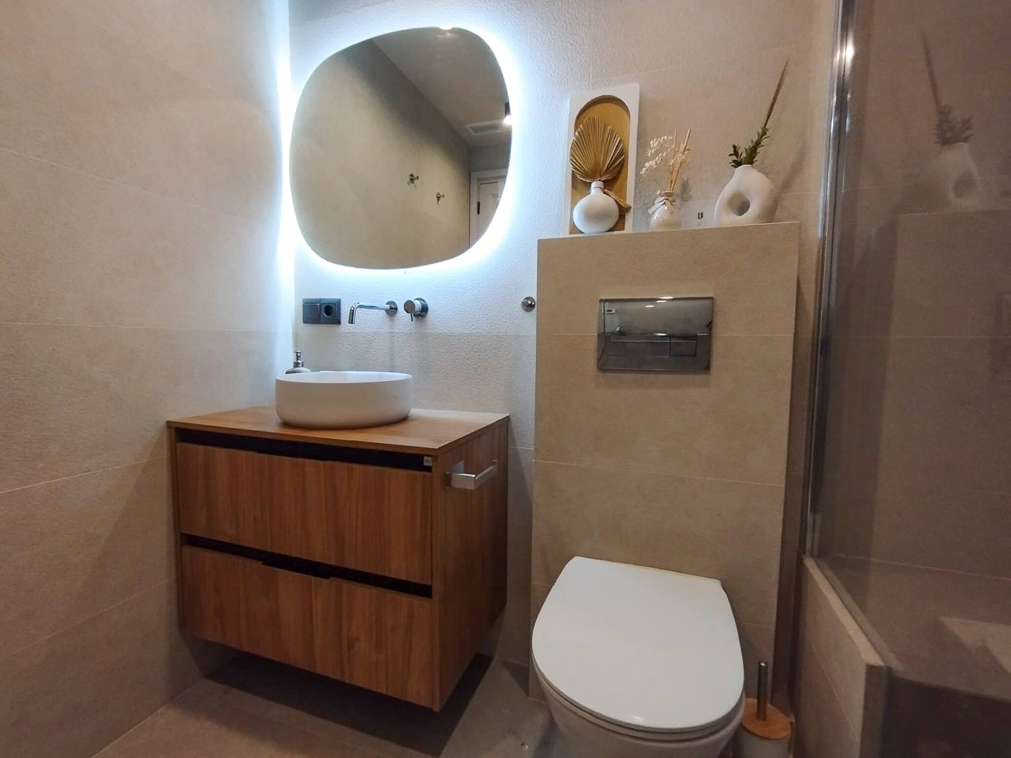 Modern bathroom with waterfall/ rain shower, modern sink with underneath storage, wall mounted mirror with backlight, hairdryer, bathrobe for each guest, WC