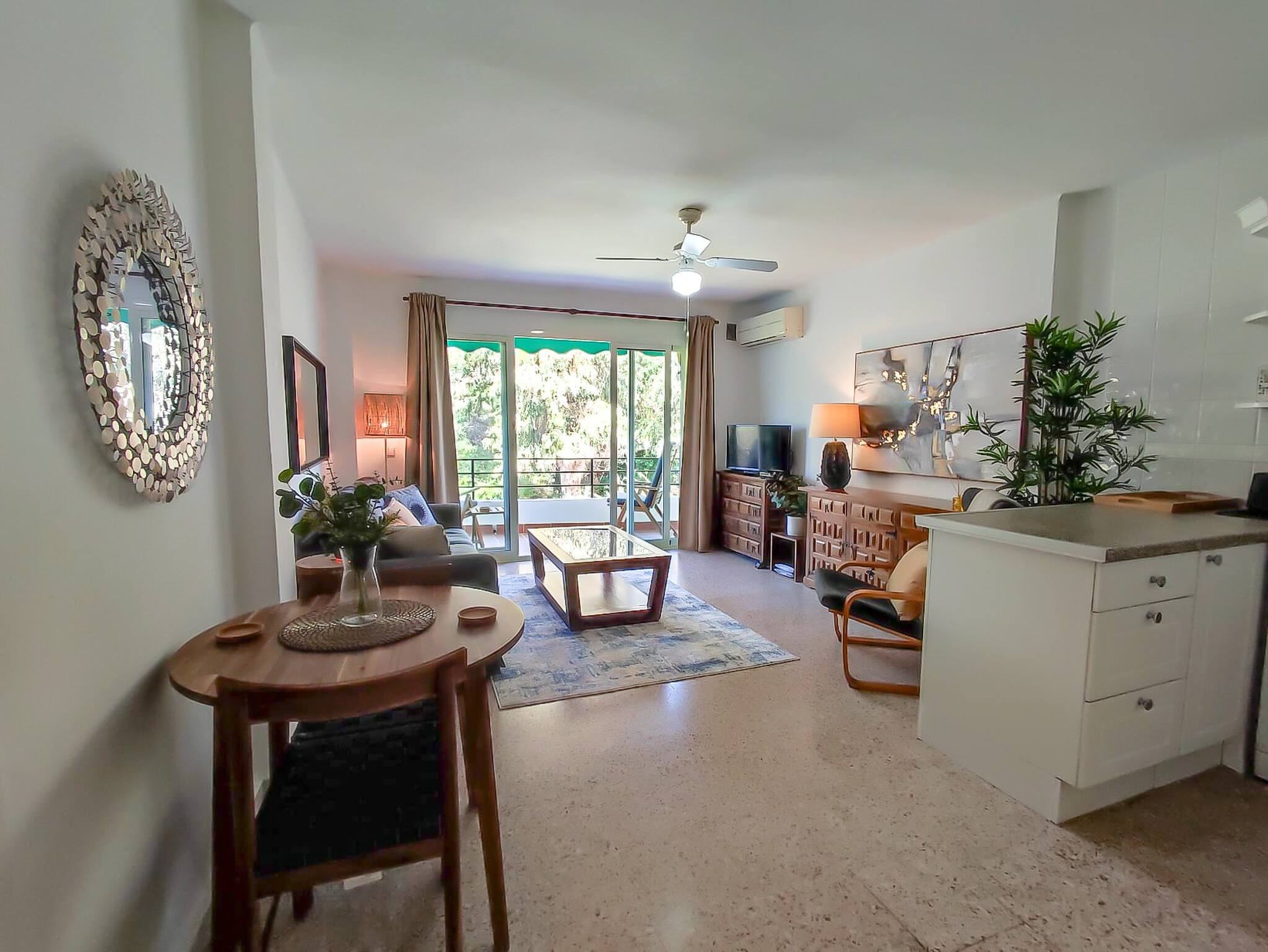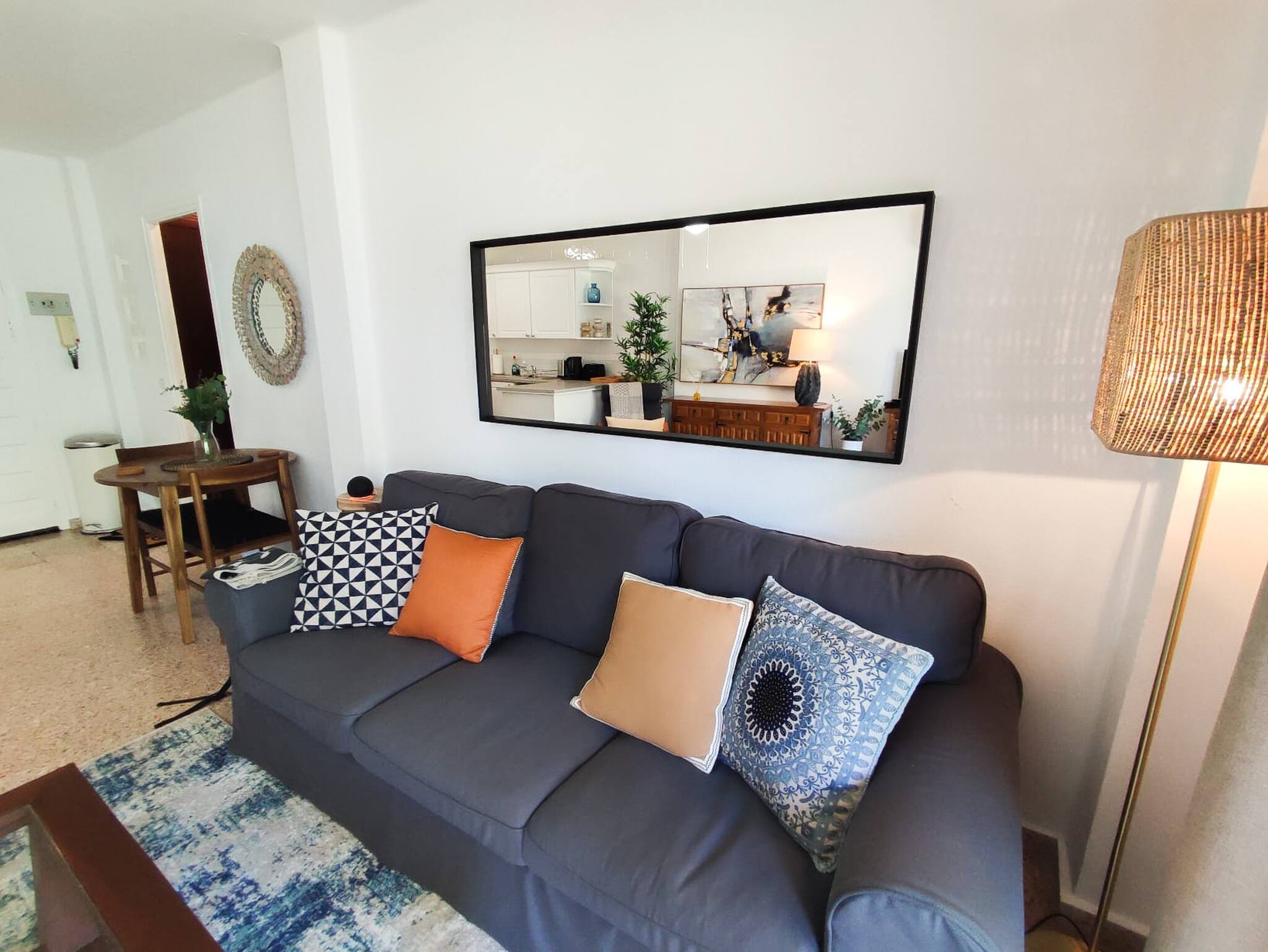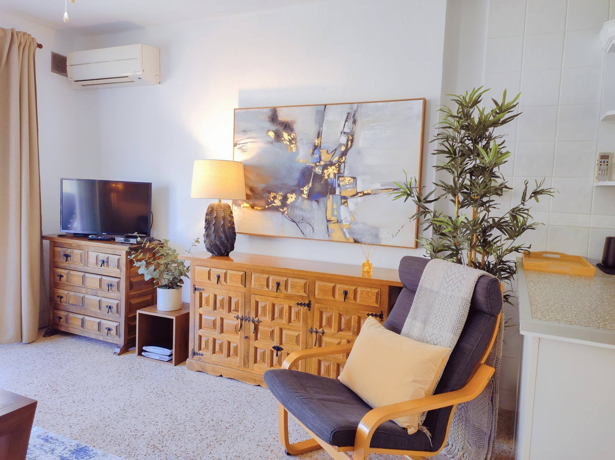 This stylish and tastefully decorated apartment is located within a short walk distance from the popular Burriana Beach. The well known Bahamas building has access to a communal pool and parking area. The property provides 1 bedroom and 1 bathroom. The private west facing balcony is overlooking the quiet and well kept communal gardens with tropical plants and fruit trees. This is a perfect property to spend hot summer days on beach or dining al fresco at one of the front beach restaurants.