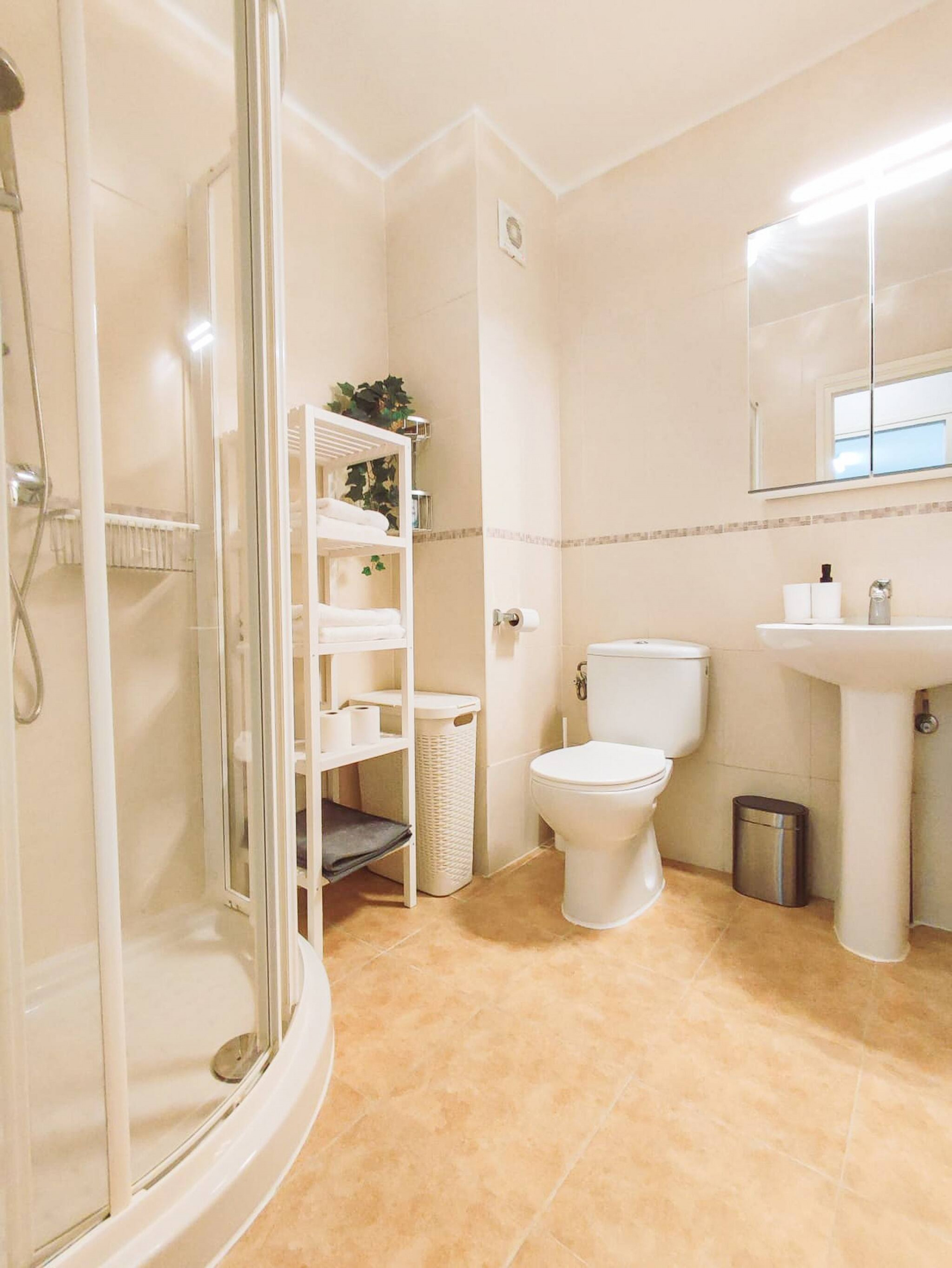 Corner shower with sliding doors, free standing sink, wooden shelf, wall cupboard with mirror and lights, WC