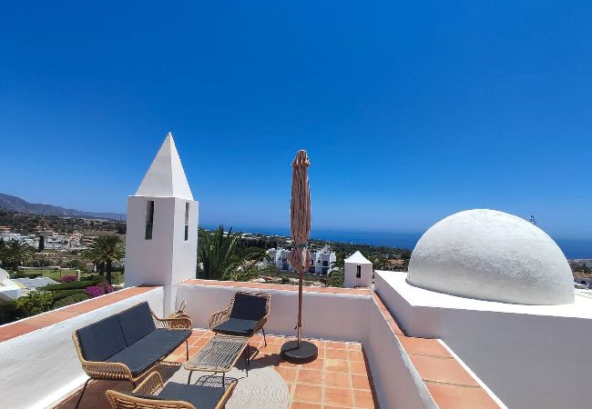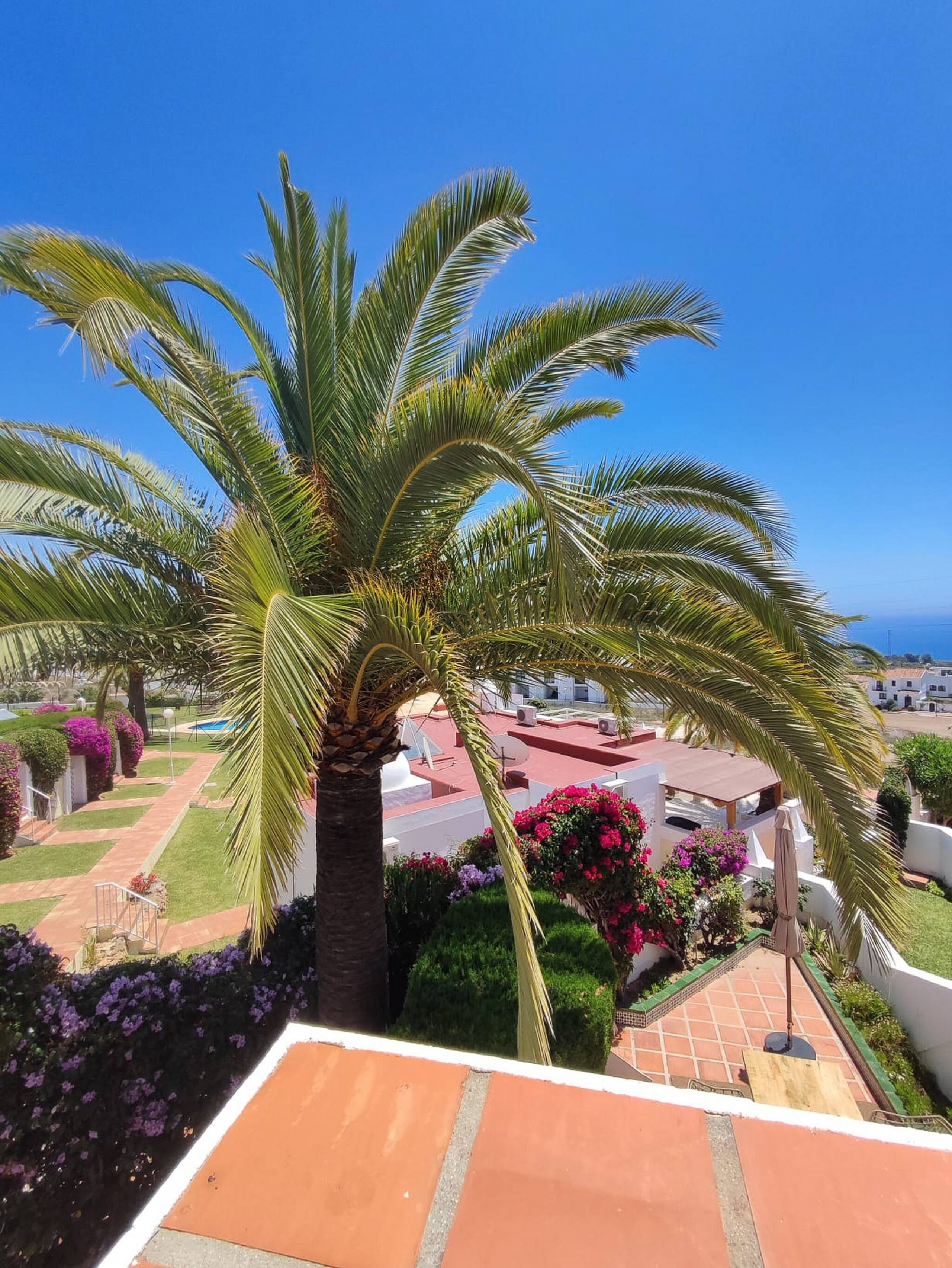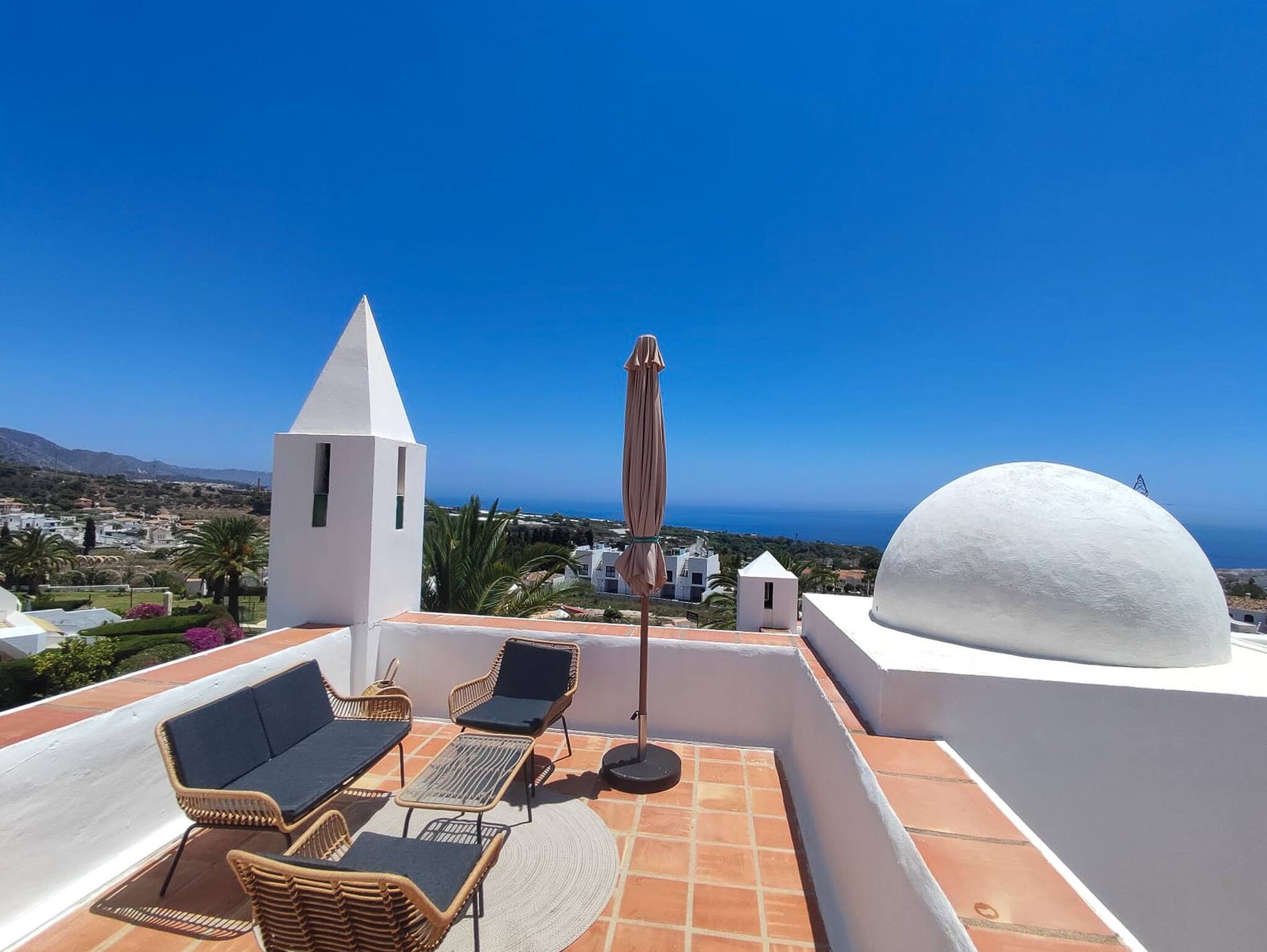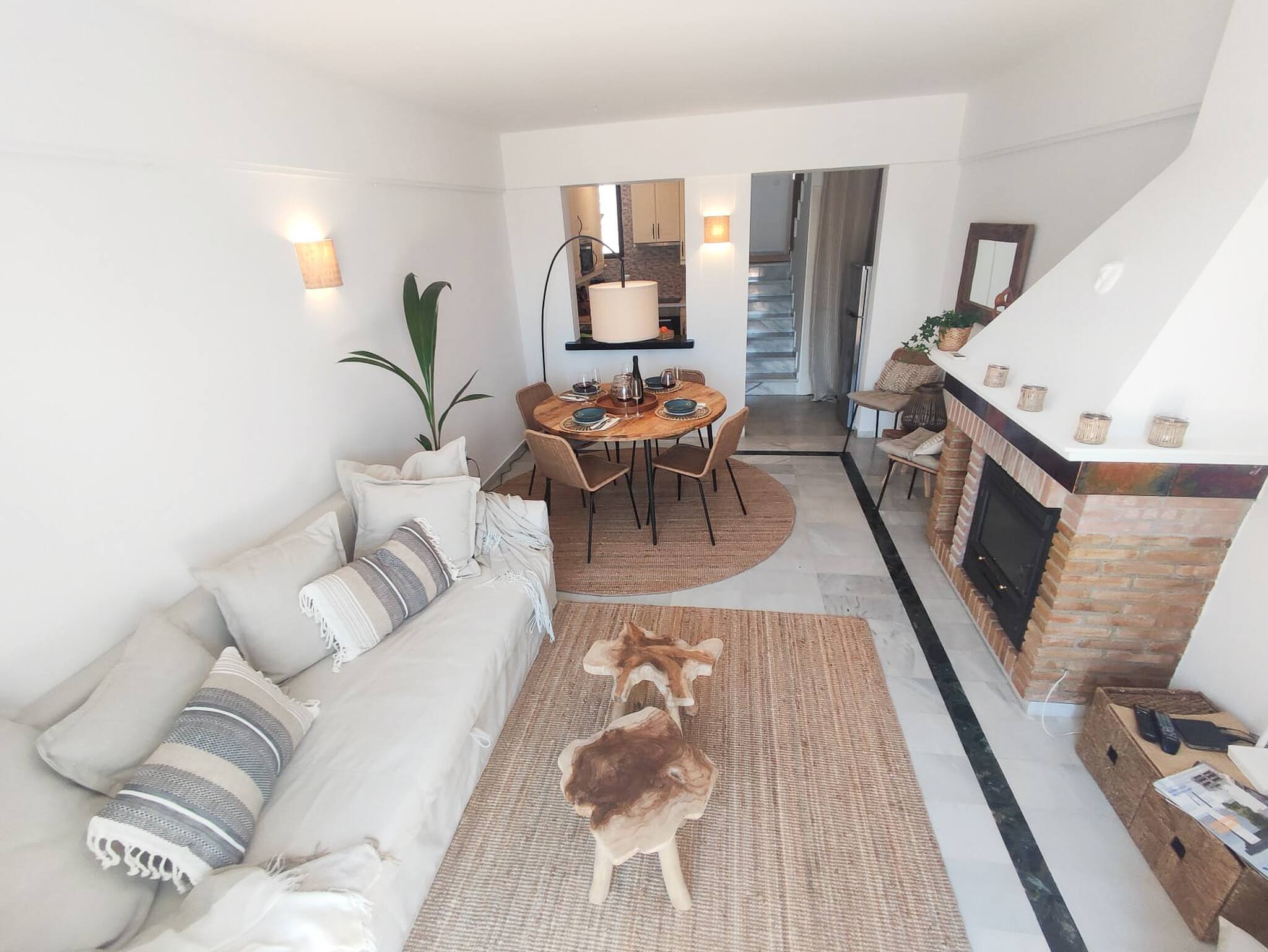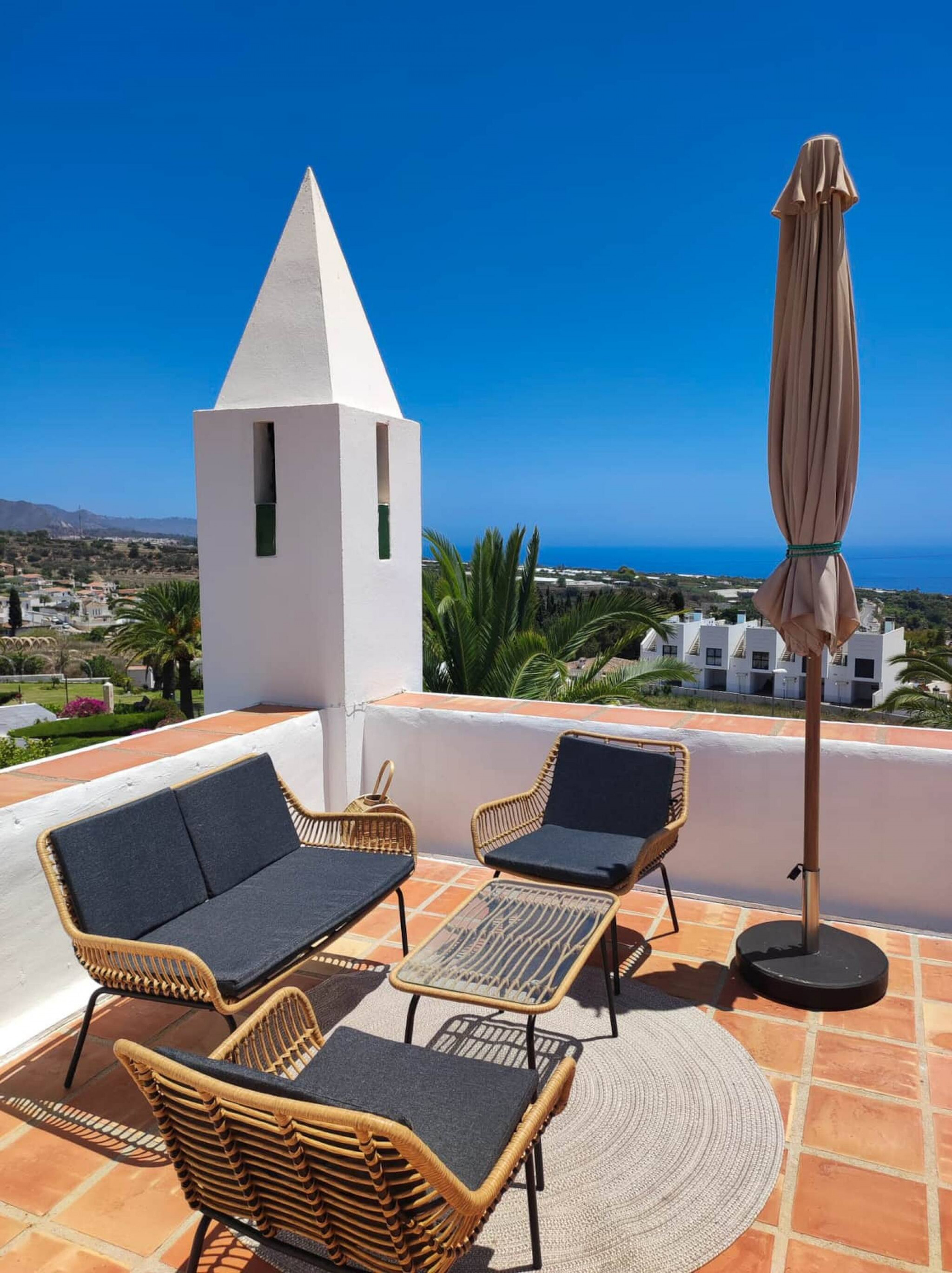 A recently refurbished 2 bedroom townhouse, located in the beautiful and well maintained Urbanisation 'Alhambra' in Nerja. The slightly elevated position of Alhambra guarantees spectacular sea views surrounded by an idyllic atmosphere with Mediterranean palm trees and flowers. The Communal pool is less than 50 meters from the property and can be easily accessed via the garden / patio. The property provides three different terraces (including a private roof terrace).