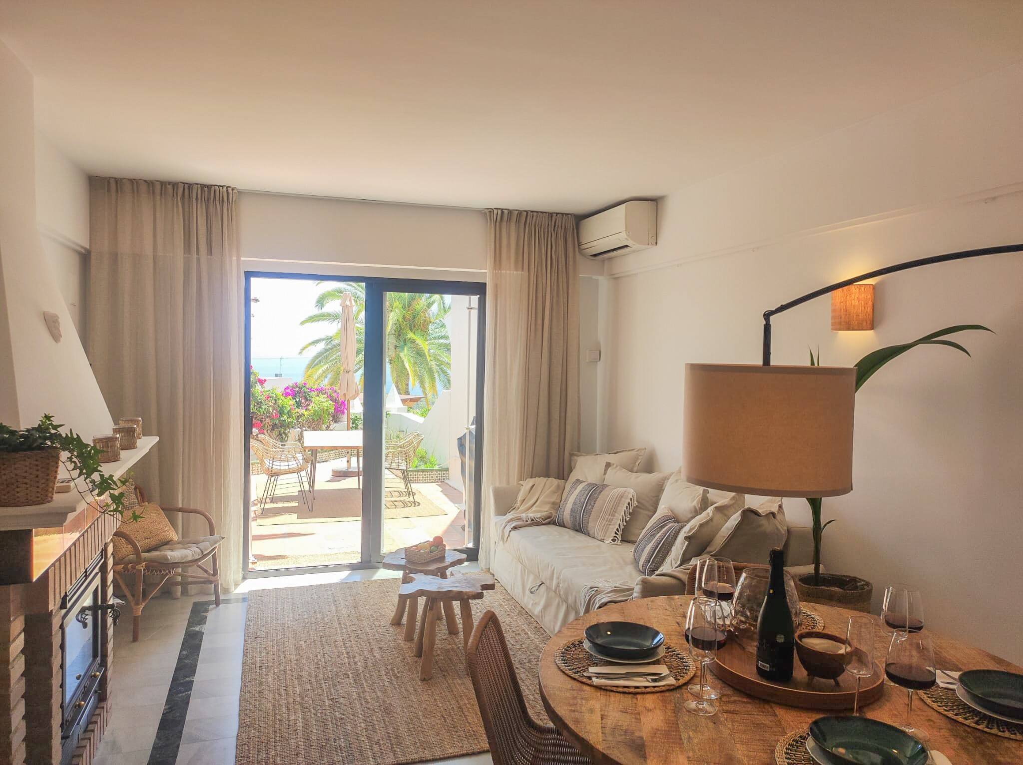3-seater sofa, coffee table, sideboard with TV, free standing lamp, dining table with chairs, access to terrace / patio, Air conditioning