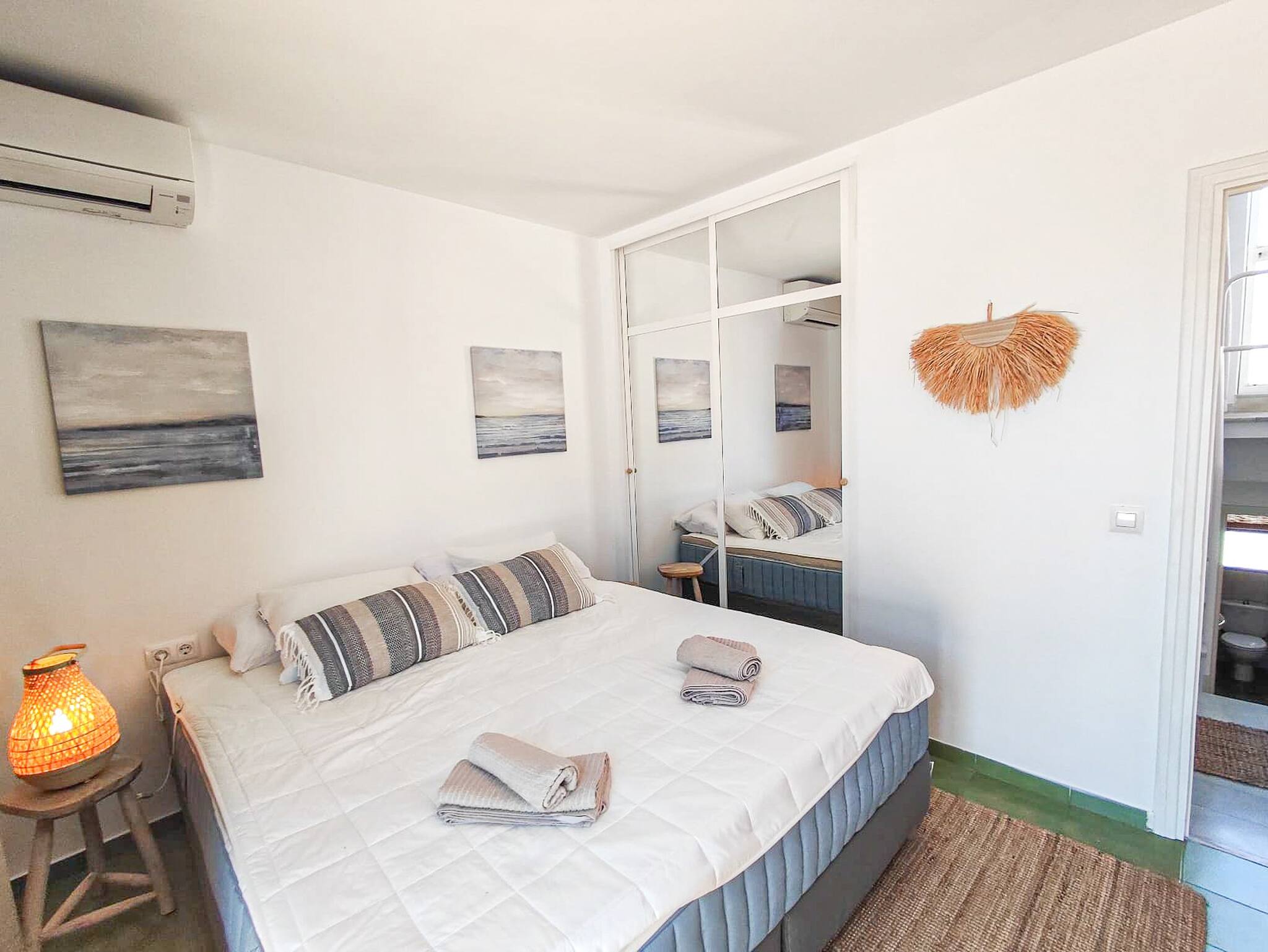 Double bed with bedside tables and lamps, large wardrobe, dressing table with chair, air conditioning unit, double door to south facing balcony