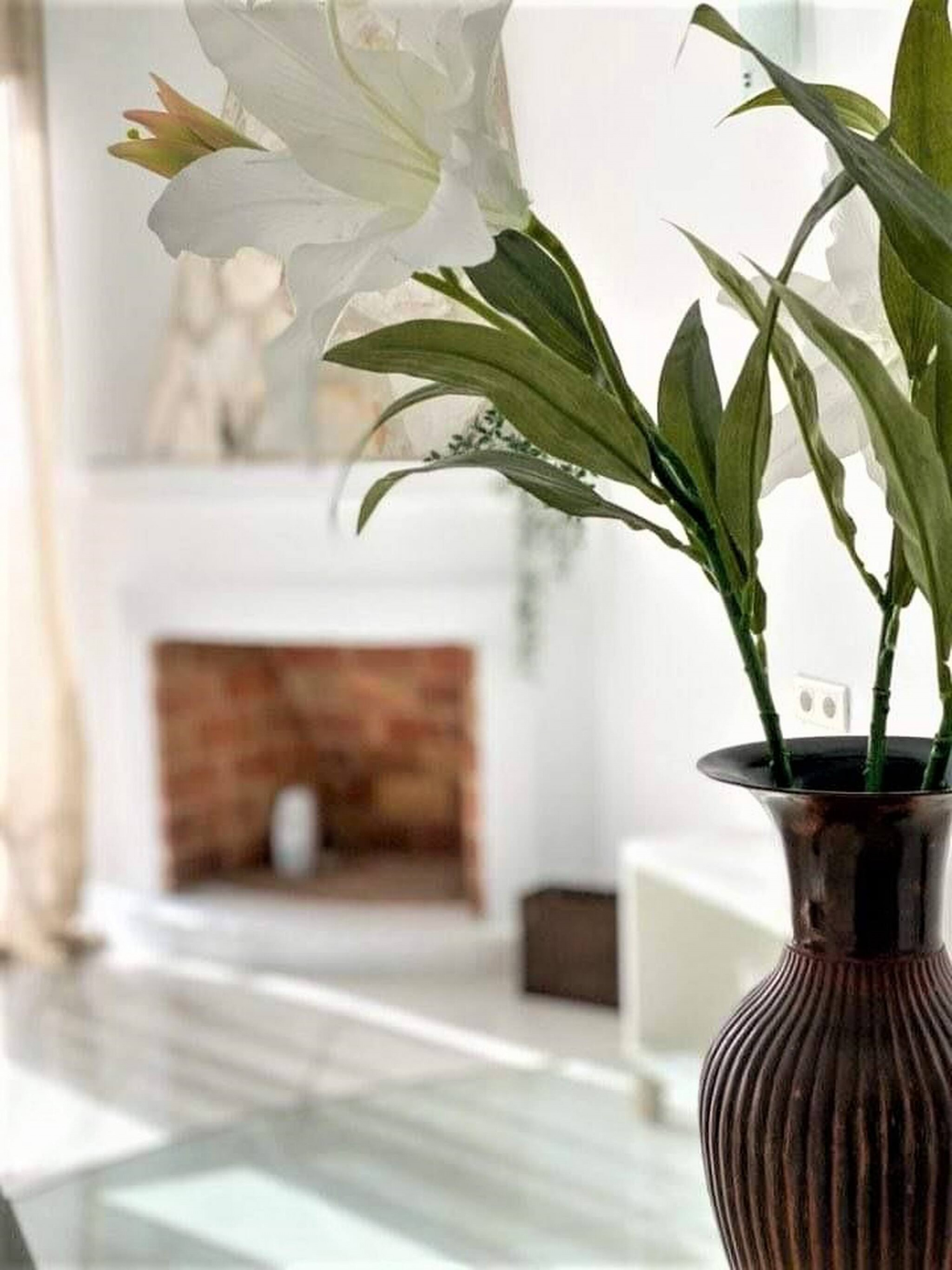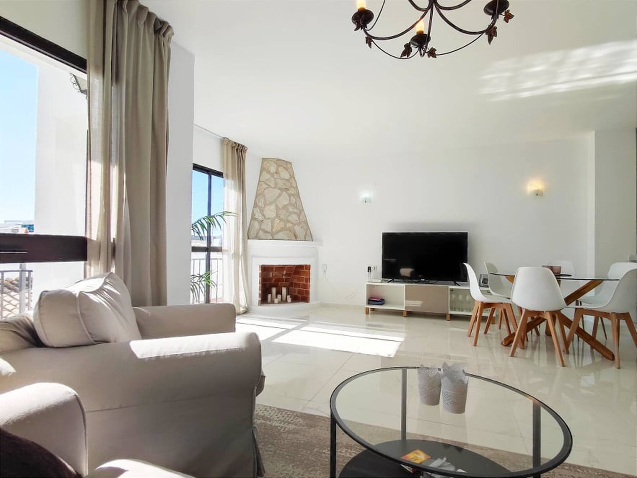 Round dining table with chairs, 2-seater sofa, armchair (1x sofa bed), TV unit with Smart TV, Chimney (decoration only), AC unit, access to south facing balcony with small table and chairs